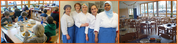 Das Mittagessen findet in der Zeit zwischen 12.45 und 14.00 Uhr statt. Im Rahmen einer Mischküche wird bei Fleisch- und Fischprodukten auf Tiefkühlkost zurückgegriffen, die Beilagen, Salate und Nachspeisen werden frisch zubereitet. Auf Schweinefleisch wird grundsätzlich verzichtet.
